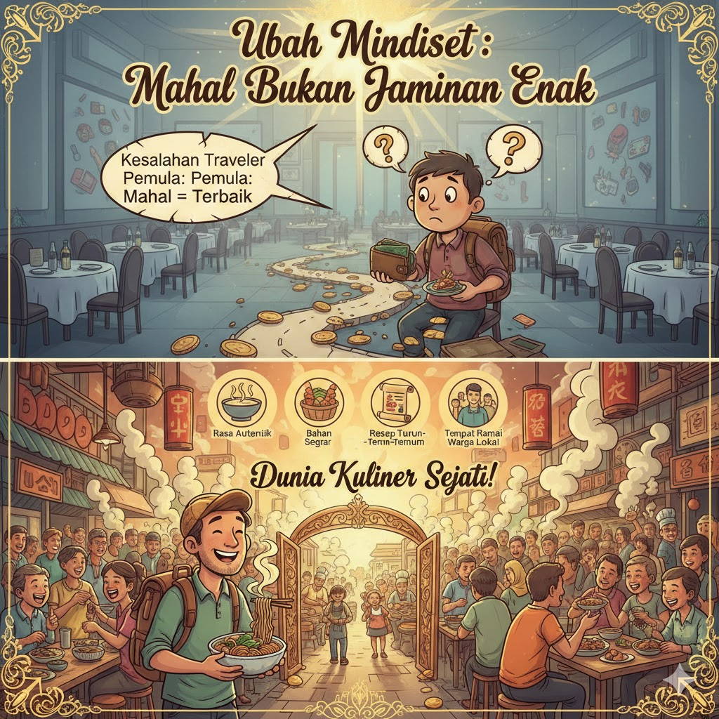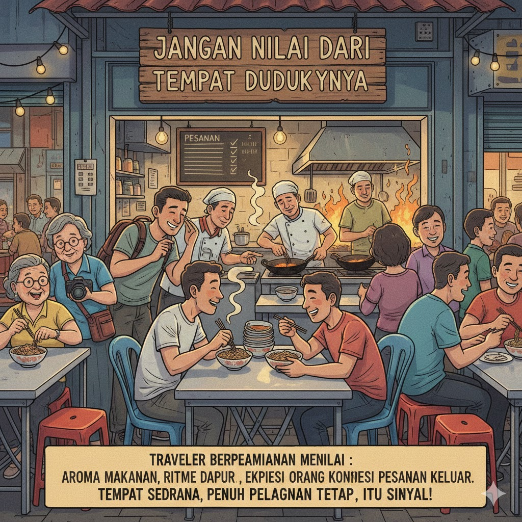 Kesalahan paling umum traveler pemula adalah mengira harga tinggi = rasa terbaik. Padahal, banyak restoran mahal menjual suasana dan branding, bukan rasa.