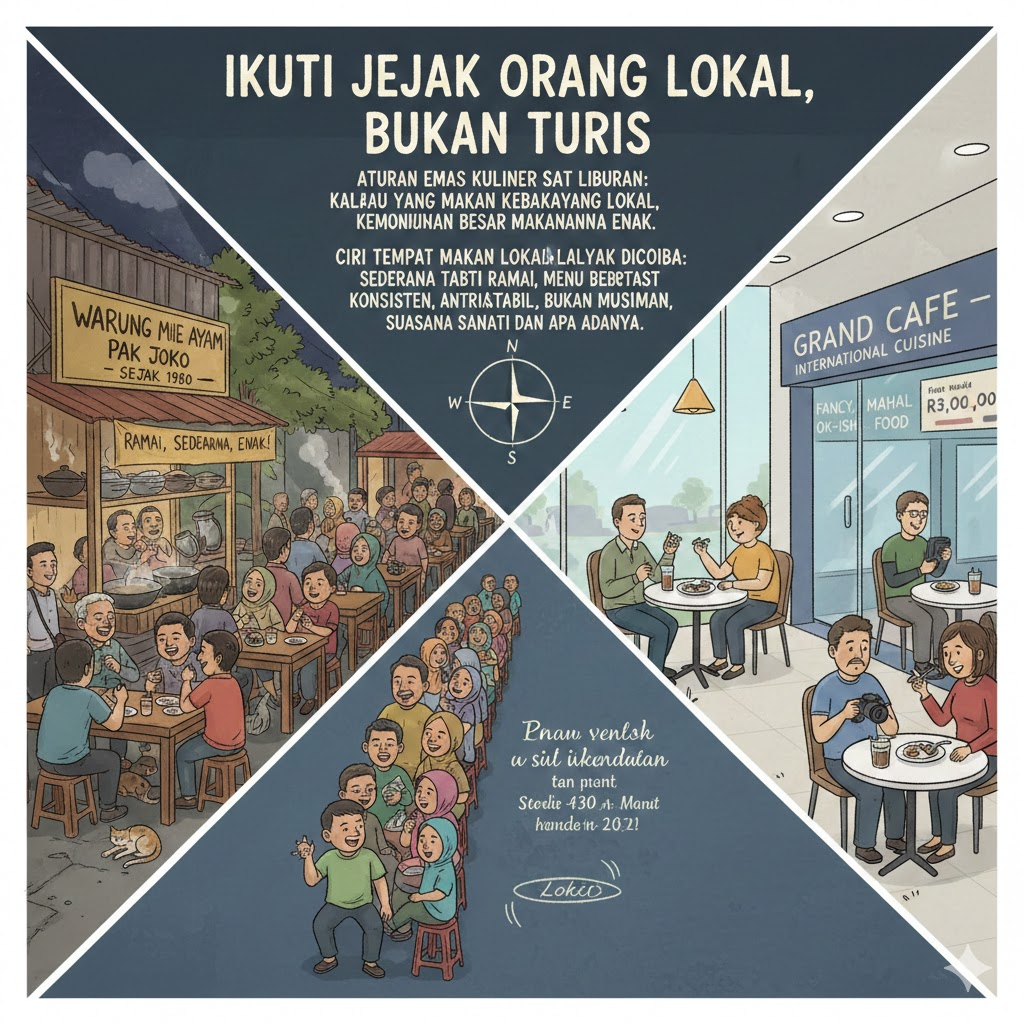 Aturan emas kuliner saat liburan: kalau yang makan kebanyakan orang lokal, kemungkinan besar makanannya enak. Tempat makan yang dipenuhi turis sering kali sudah disesuaikan rasanya, harganya dinaikkan, dan kualitasnya diturunkan demi volume.