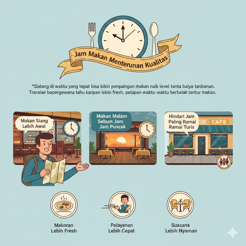 Datang di waktu yang tepat bisa bikin pengalaman makan naik level tanpa biaya tambahan. Traveler berpengalaman tahu kapan waktu terbaik untuk makan.