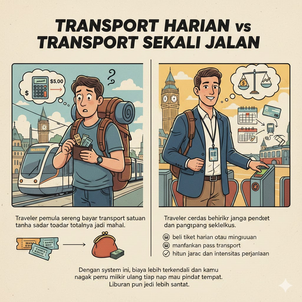 Traveler pemula sering bayar transport satuan tanpa sadar totalnya jadi mahal. Traveler cerdas berpikir jangka pendek dan panjang sekaligus.
