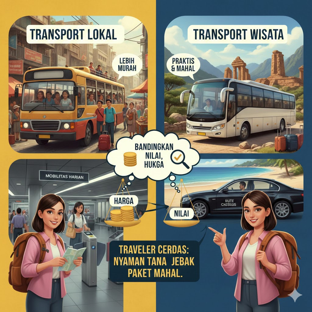 Di banyak destinasi, ada perbedaan antara transport lokal dan transport wisata. Yang satu lebih murah, yang lain lebih praktis tapi mahal.
